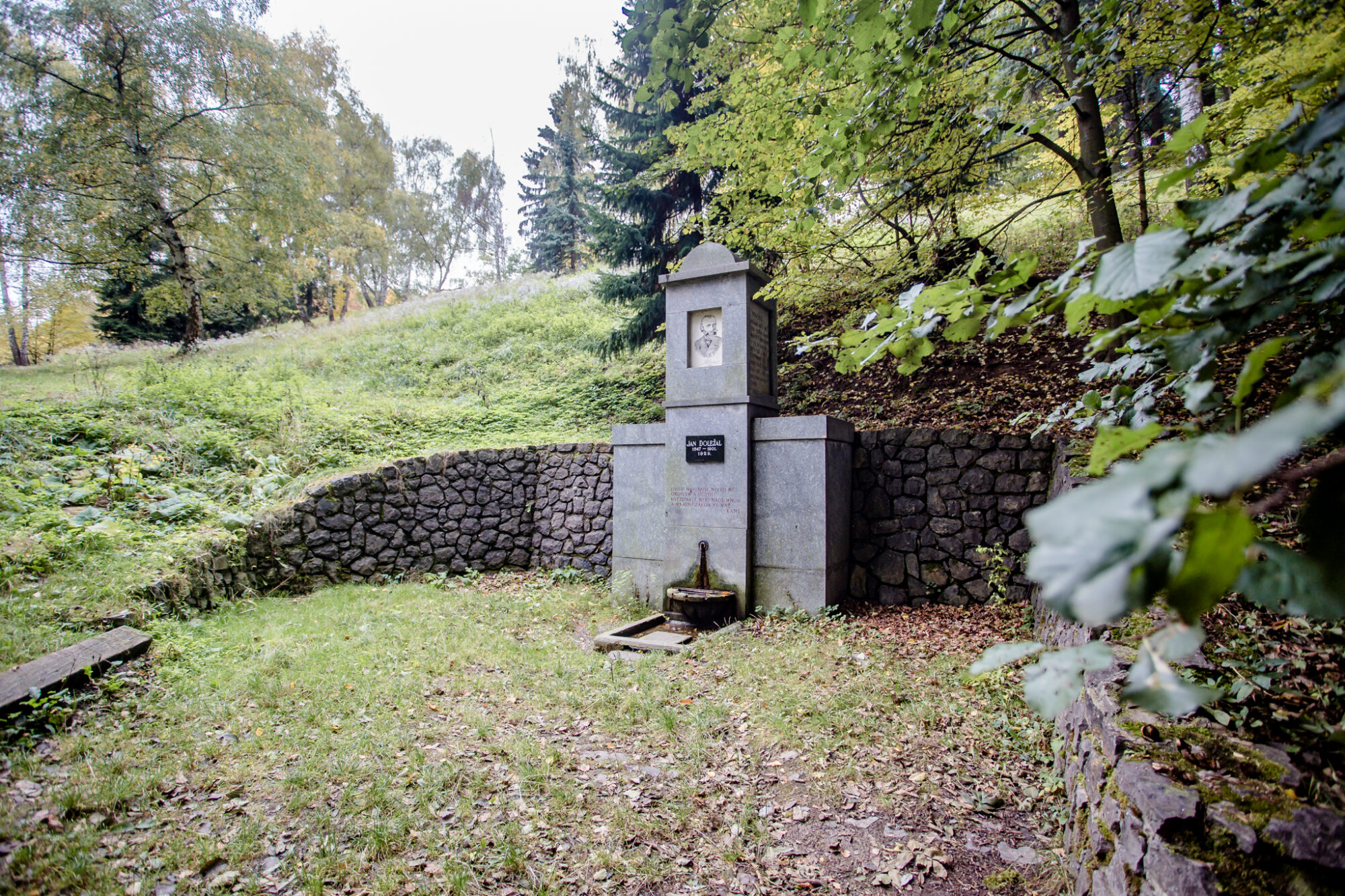 Horní blok studánky s podobiznou Jana Doležala a bočními nápisy byl prof. Josefem Opletalem dodatečně
