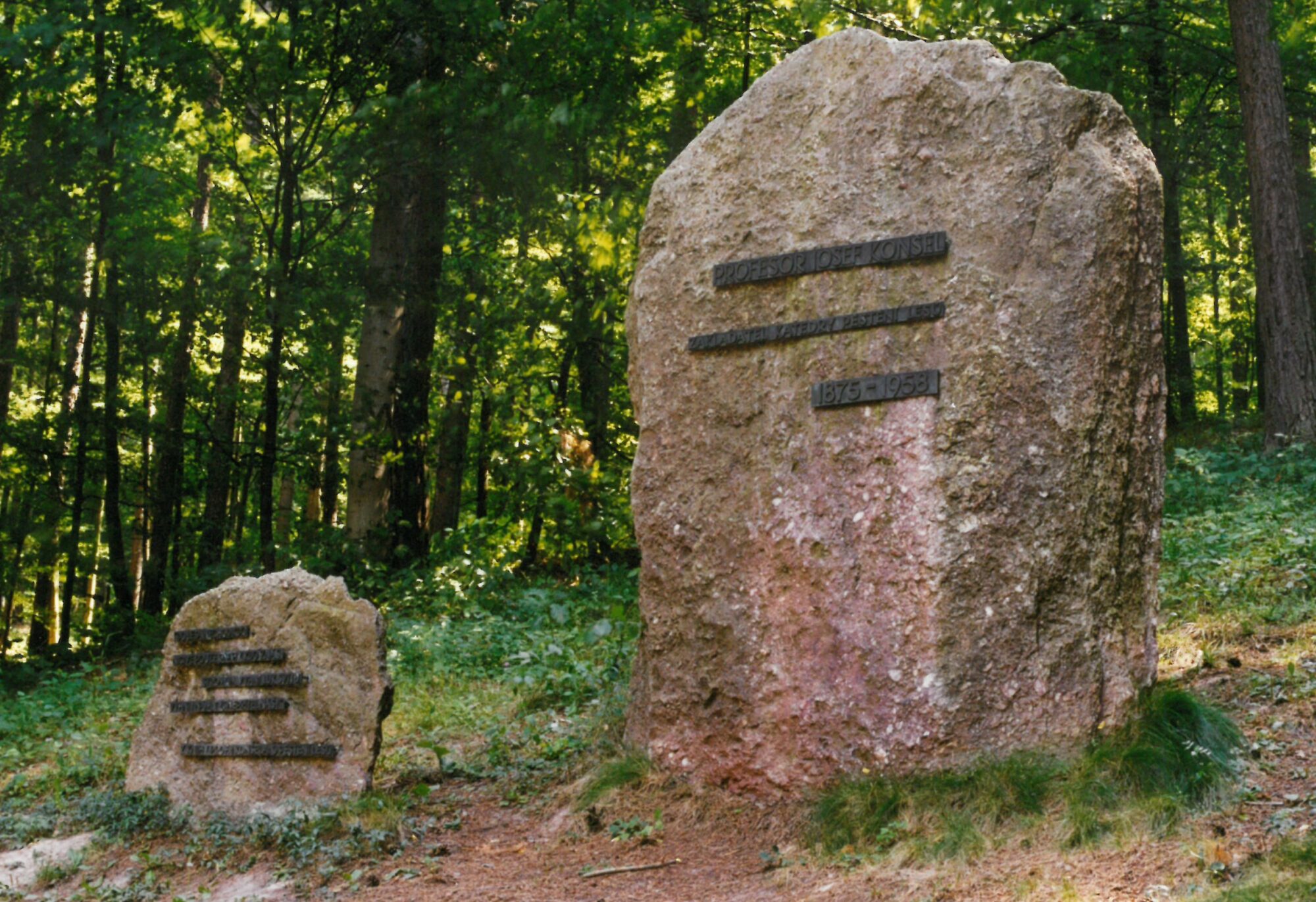 názvosloví. Celé dílo Josefa Konšela je prodchnuto myšlenkami, k nimž se vlastně vrací současné lesnictví a hnutí Pro Silva, které hovoří o přírodě blízkém obhospodařování lesů. Tyto cíle o padesát let dříve mnohem výstižněji vyjádřil Josef Konšel termínem pěstění lesů v biologickém ponětí. U tak významné osobnosti brněnské Lesnické fakulty, jakou prof. Josef Konšel byl, se samozřejmě uvažovalo o uctění jeho památky v Lesnickém Slavíně. Na základě usnesení vědecké rady fakulty bylo na exkurzi konané při oslavách 40. výročí založení Lesnické fakulty v Brně v r. 1959 pojmenováno tehdejší polesí Hády „Polesím prof. Konšela“ (Vašíček 1959). Polesí Hády bylo zvoleno proto, že do něho prof. Konšel soustředil svoji odbornou činnost na ŠLP. Toto pojmenování se však nevžilo a nebylo vůbec používáno. Proto se po deseti letech přistoupilo k vybudování památníku prof. Josefa Konšela, jehož zřízení financovala tehdejší Vysoká škola zemědělská a lesnická v Brně. Vyhotovení památníku bylo zadáno výrobnímu družstvu Kamena v Blansku. Místo pro památník zvolil prof. Bohuslav Polanský, nástupce prof. Josefa Konšela. Vybral na polesí Bílovice vyvýšené