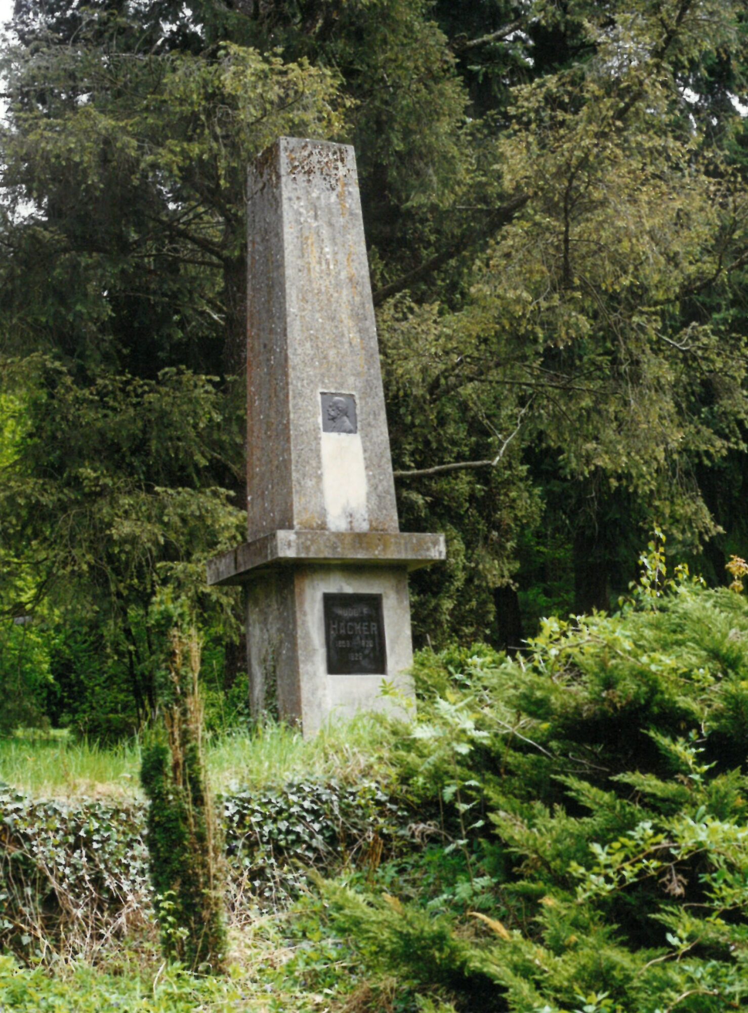 a v ní byl Rudolfu Hackerovi postaven památník ve formě obelisku. Na něm je umístěna bronzová podobizna Rudolfa Hackera a pod ní žulová deska s nápisem: