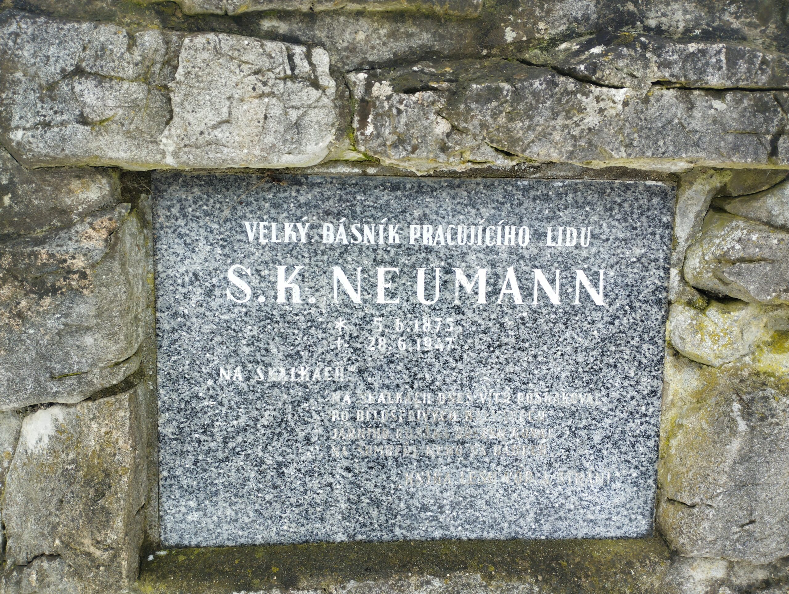 Na skalkách na skalkách dnes vítr poskakoval po bělošedých balvanech jarního rusáka březen koval na Šumbeře nebo na Hádech Kniha lesů , vod a strání Památník byl vybudován v r. 1960 v rámci akce Duben – měsíc lesů. Hlavním řečníkem slavnostního odhalení byl prof. Josef Hrabák. Přítomna byla i básníkova